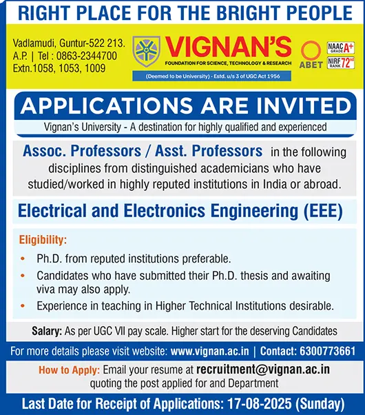 Vignan’s (Deemed to be University), Vadlamudi, Guntur, Andhra Pradesh, is a reputed multi-disciplinary university recognized for quality teaching and research. The University invites applications from highly qualified and experienced candidates for Electrical & Electronics Engineering (EEE).